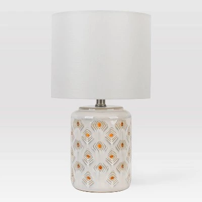 Add a designer look and sparkle to any space in your home with the Diamond Cutout Table Lamp with Lit Base from Opalhouse™. Founded atop a white ceramic base, this decorative table lamp is adorned with diamond cutouts accented with golden highlights that become even more prominent when light falls on them, helping to add an air of visual intrigue to the cylindrical silhouette. It’s topped with a classic white fabric drum lampshade to bathe your space in a soft glow. Keep it at the center table, side table or entryway console for a functional and stylish lighting solution that’s easy to match with an array of decor styles.